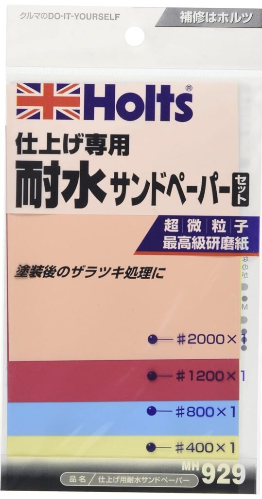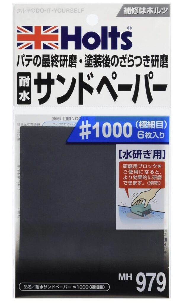 耐水サンドペーパー(#1000番以上)で表面を軽く削り、ブツをならしましょう。 ホルツの「耐水サンドペーパー#1000番」は極細目、水に強いので破れにくく長持ちするのでおすすめです。