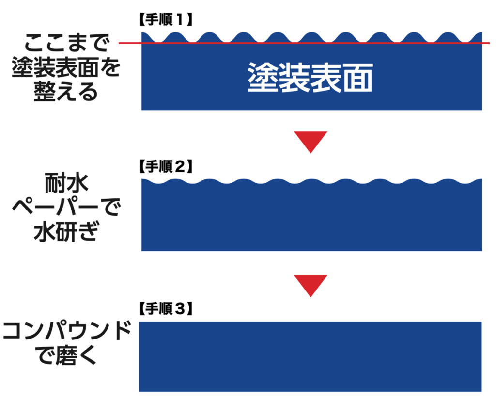 塗装表面を▶︎耐水ペーパーで水研ぎし▶︎コンパウンドで磨くことでゆず肌を平滑にし、ツヤのある塗装表面に復活させることができます。