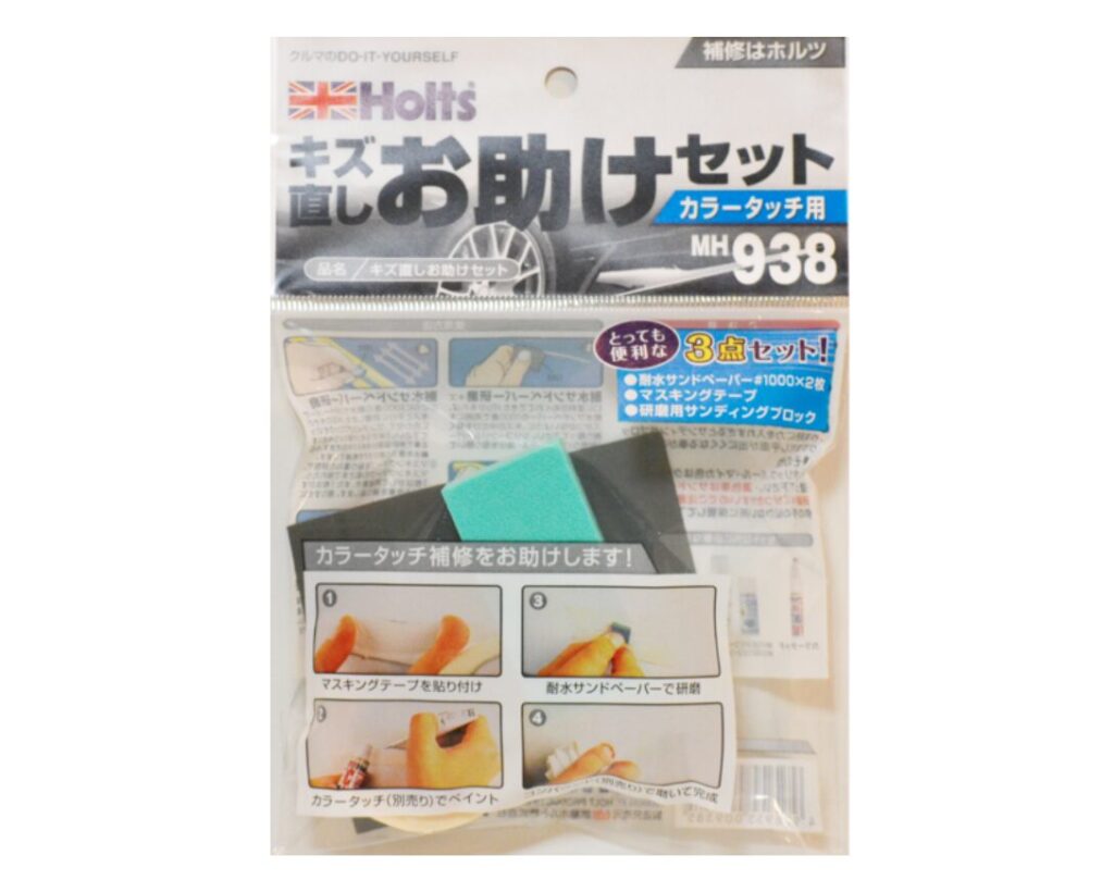 車の小傷補修に必要な道具が一式そろったセット商品です。サンドペーパー・サンディングブロック・マスキングテープがセットされており、後は塗装色と同じカラーナンバーのカラータッチ(タッチアップ塗料)を準備すればすぐに補修作業ができます。